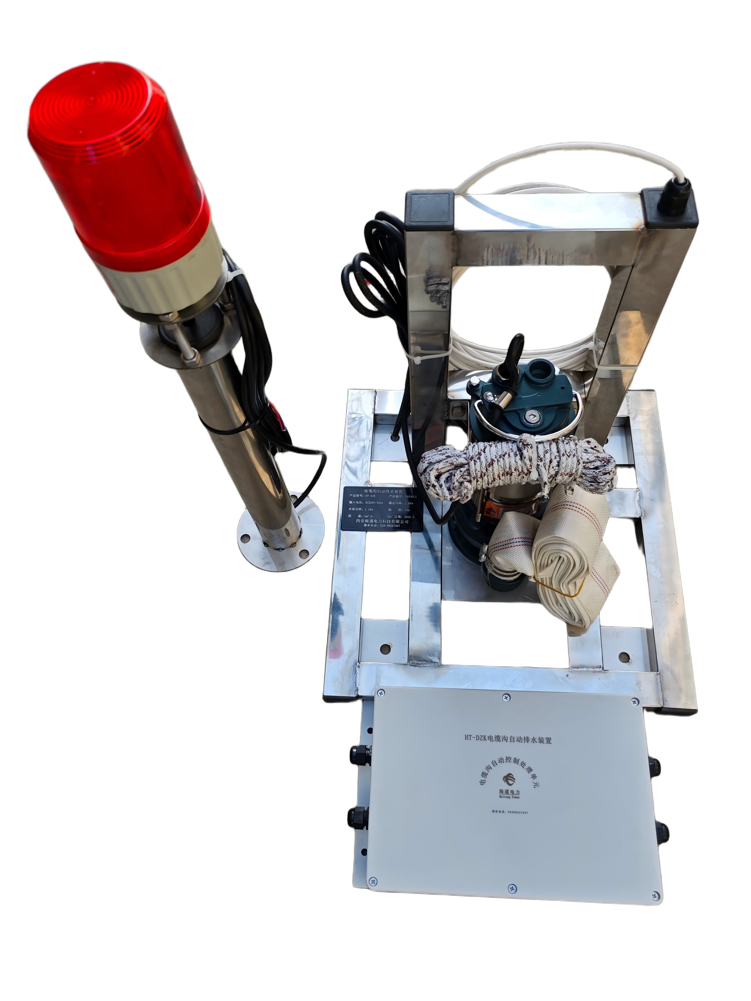 HT-DZK-II 电缆沟监测自动排水装置由液位传感器、控制处理单元、潜水泵、声光报警及多种电气配件组成, 可通过 RS485 或 4-20ma 远端传输,实现对电缆沟内的积水监测,超标自动抽排。